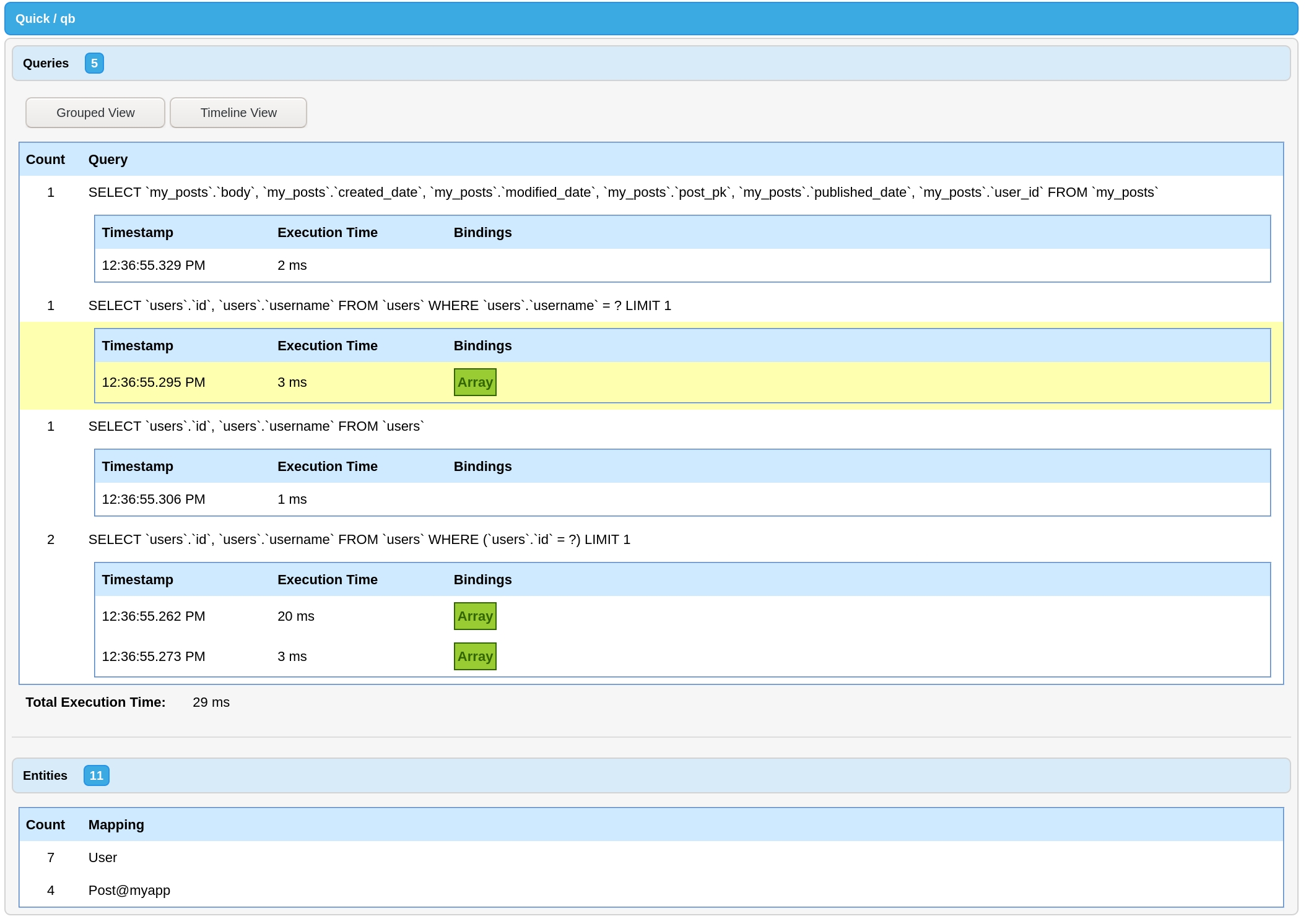 Starting in cbDebugger 2.0.0 you can view all your Quick and qb queries for a request. This is the same output as using qb standalone. This is enabled by default if you have qb installed. Make sure your debug output is configured correctly and scroll to the bottom of the page to find the debug output.
