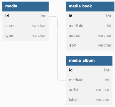 If the data for your discriminated entities is normalized across multiple tables, you should use the multi-table inheritance (MTI) method for creating discriminated entities. In the example below, The Media entity has two subclasses, MediaBook and MediaAlbum. The discriminator column for the entities is the type column in the media table and the distinct properties for each subclass come from the media_book and media_album tables.